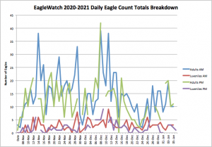 January 6 marked the conclusion of our 2020-2021 EagleWatch season. This season began in its modified form on November 7, and that made for two whole months of EagleWatching at Eagle Run dike! Due to the pandemic, we altered our usual schedule of weekend half-day shifts to two counts daily. With the suspension of the educational portion of the EagleWatch program, this modified schedule offered the opportunity for our dedicated group of volunteers to sign up for multiple shifts and to head out to the dike on their own to monitor safely. We organized ourselves through Sling and email scheduling, and managed to overcome most obstacles that Sling presented.