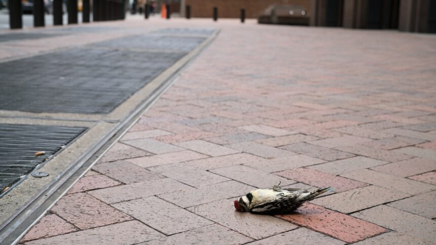 A dead woodpecker on the sidewalk. (photo by Billie Grace Ward on Wikimedia Commons) Attribution 2.0 Generic